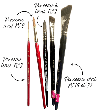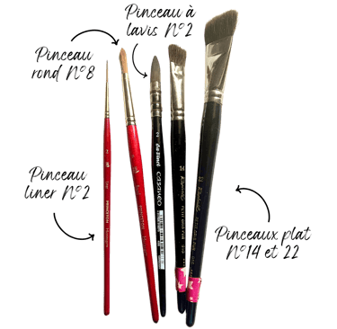1 pinceau à lavis à poil naturel + 2 pinceaux à poil synthétique : rond et liner.